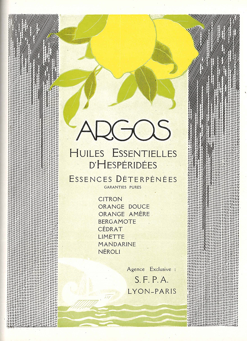Cette publicité parue dans La Parfumerie Moderne en 1925 promeut les huiles essentielles d’hespéridées.